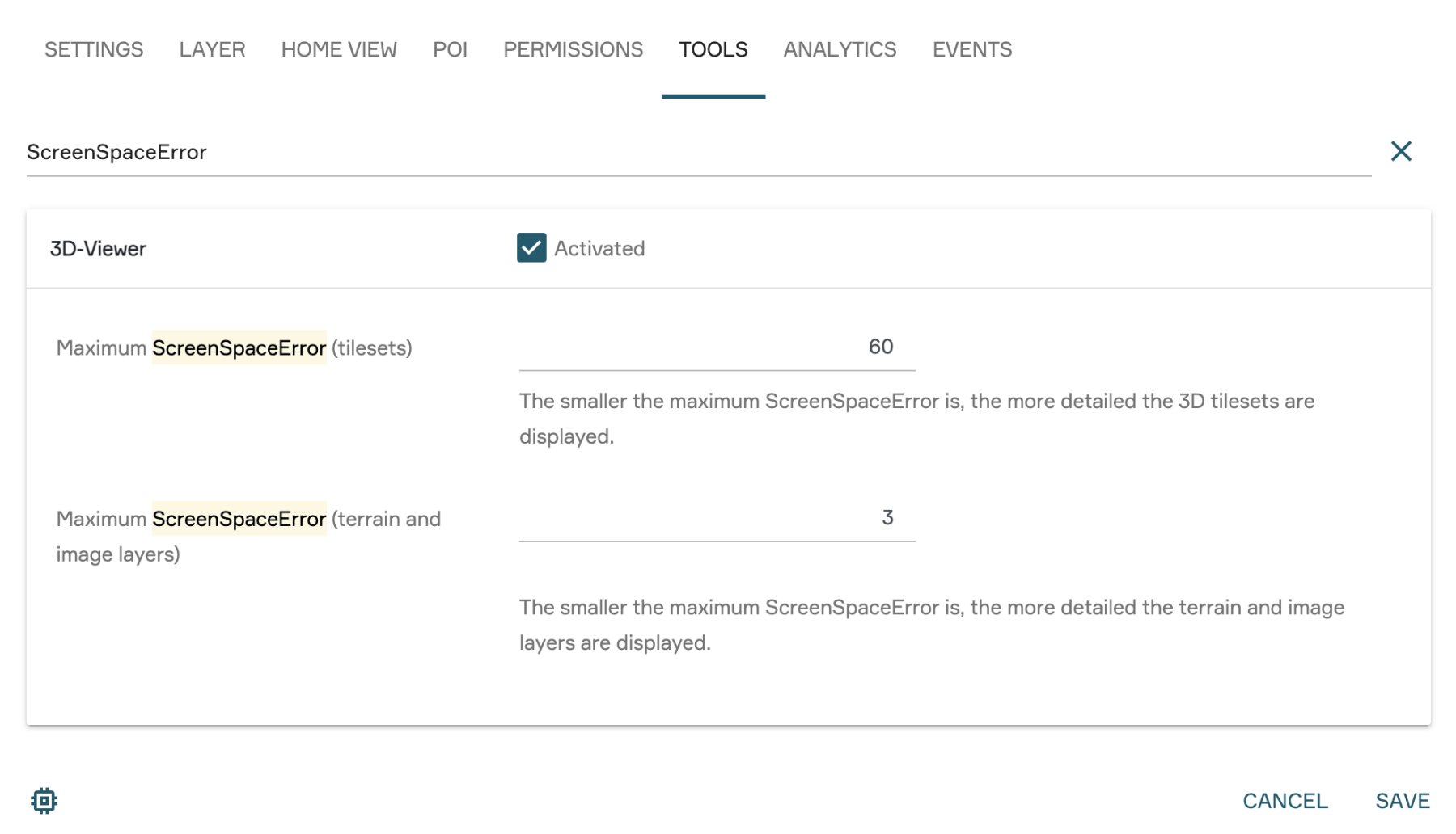 The ScreenSpace Error (SSE) that you set for the entire View within the View settings in the 3D viewer under Tools applies by default to all layers displayed in that View. It serves as the base quality value and determines the maximum tolerance for visual error for all content. A standard value range here is between 50 and 80.