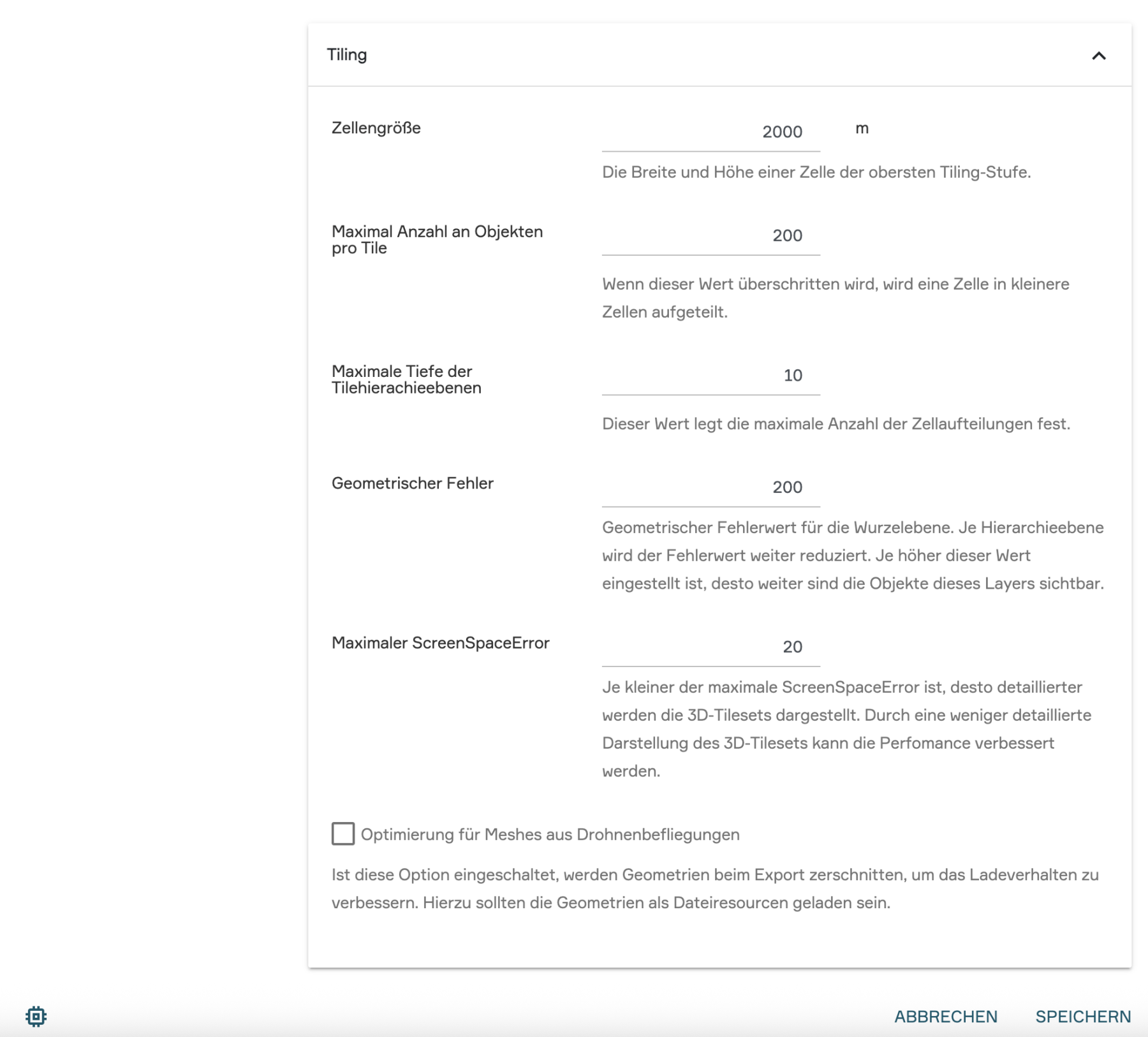 Für 3D-Tiles sollte der ScreenSpaceError zwischen 20 (3D-Mesh) und 80 (LoD2 Gebäude oder Vegetation) liegen.