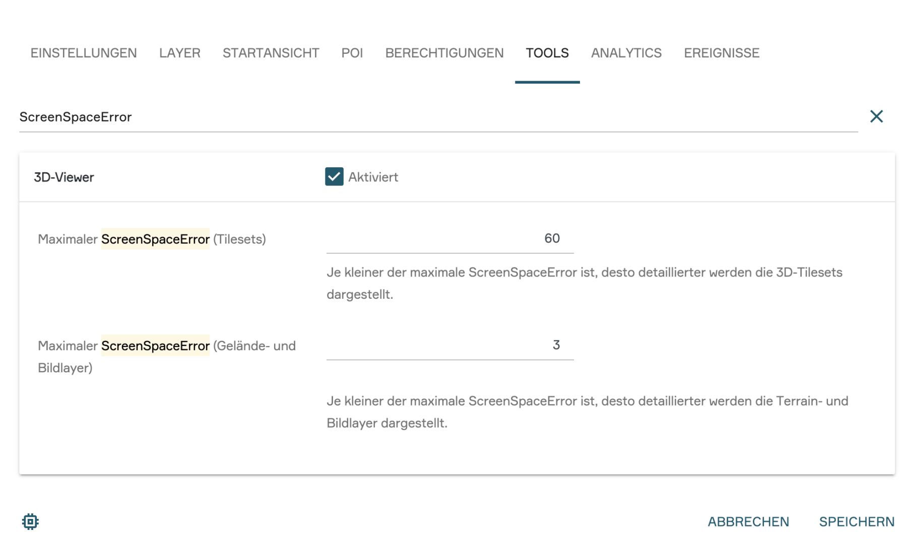 In den Vieweinstellungen, unter dem Reiter „Tools“, in dem Abschnitt „3D-Viewer“ finden sich diverse Einstellungen zu dem Lade- und Tilingverhalten von 3D-Tiles- sowie Bild- und Terrain-Layern.